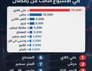 تصدّر مسلسل علي كلاي قائمة المسلسلات الأكثر بحثًا على محرك البحث Google خلال الأسبوع الثالث من شهر رمضان، بعدما سجل نحو 55,200 عملية بحث، متفوقًا بفارق كبير على باقي الأعمال المعروضة في الموسم الرمضاني. وجاء في المركز الثاني مسلسل درش بنحو 15,500 عملية بحث، بينما احتل مسلسل النص التاني المركز الثالث بحوالي 5200 عملية بحث. وفي المركز الرابع جاء مسلسل…